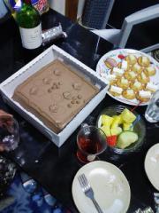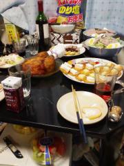 チキンライス詰めの鶏まるごと一匹とクラッカーとサラダと果物とケーキとピザとワインといろいろでパーティーしました